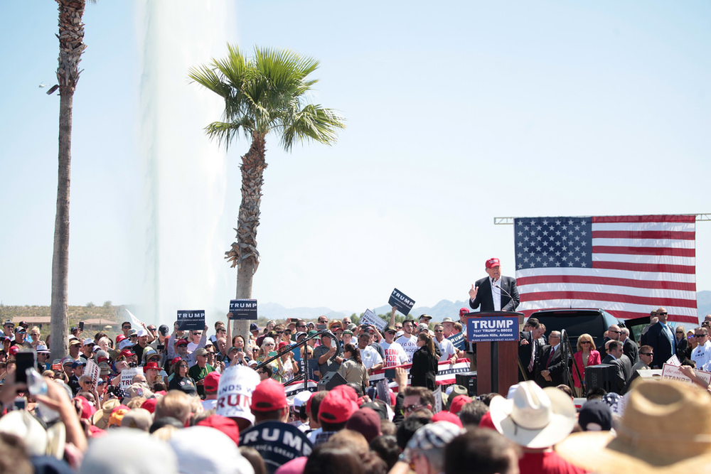 (TOP PHOTO: Donald Trump speaking to supporters at an election campaign rally in Fountain Hills, Arizona. CREDIT: Gage Skidmore/Flickr)