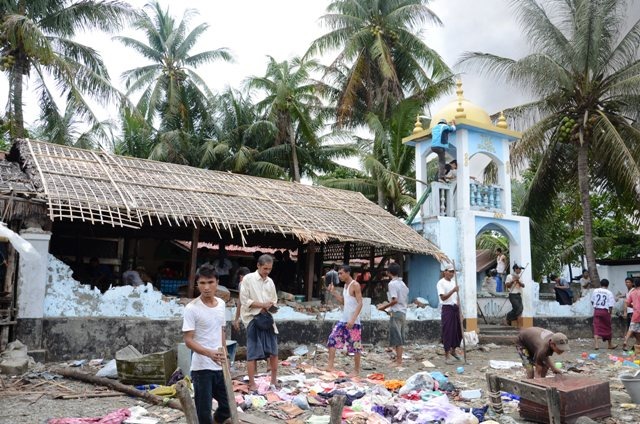 Local Rakhine residents dismantle and loot the site of a destroyed mosque in Sittwe in June 2012. Some 140,000 people were displaced by sectarian violence in Rakhine State in 2012