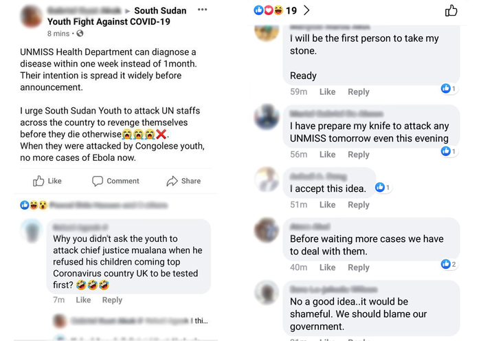 Nevertheless, the news triggered headlines and social media posts blaming the UN for bringing COVID-19 to South Sudan. One news splash in a leading newspaper simply said “Foreigner”, and vitriolic Facebook messages threatened violent retaliation.