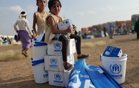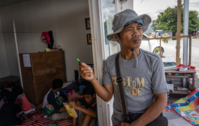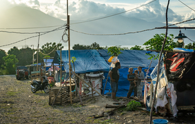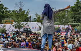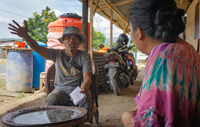 Yardin Hasan interviews residents of a temporary shelter in Palu for Kabar Sulteng Bangkit. -