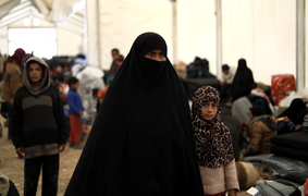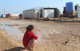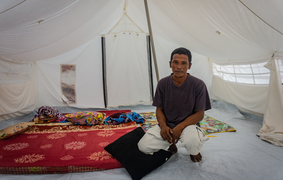 Riswan’s displaced family sleeps in this tent near a relative’s home, though there are empty temporary housing units nearby. -