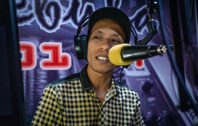 Radio Nebula manager Andre Delano broadcasts from the station’s studio. Once a week the state hosts a call-in show with the International Red Cross that allows locals connect to aid and government workers. -