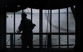 A member of the Congolese naval forces walks along the deck of a boat on the Congo River weeks after the massacre in Yumbi. -