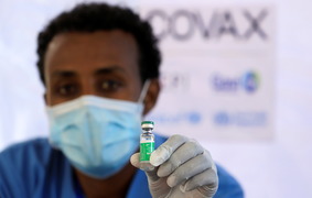 A nurse displays the AstraZeneca/Oxford COVID-19 vaccine supplied under the COVAX scheme at a hospital in Ethiopia, on 13 March, 2021. -