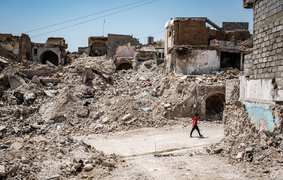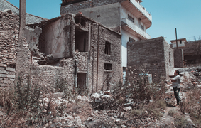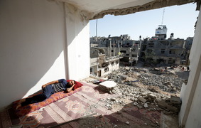 A Palestinian man sleeps in the ruins of his house that was destroyed in Israeli air strikes, Gaza June 9, 2021. -