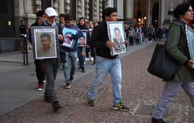 Marchers hold up signs with the names and faces of the "desaparecidos", migrants who have gone missing while crossing the Mediterranean. -