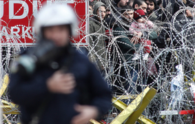 Greek riot police patrol along the barbed-wire fence at the Kastanies border checkpoint as asylum seekers gather on the Turkish side on 2 March 2020. -