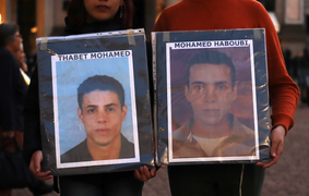 Protesters hold pictures of the faces of missing loved ones. Mohamed Habboubi, 22, disappeared in 2012. -